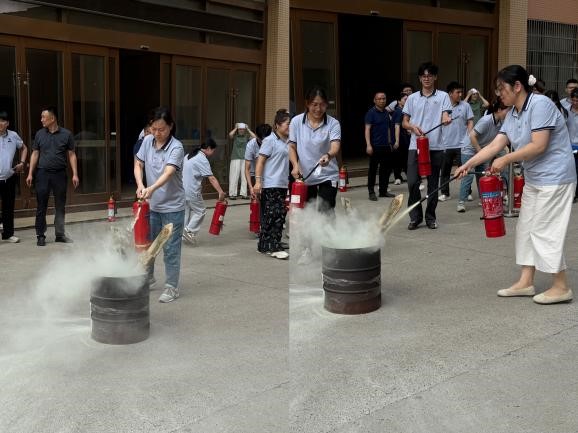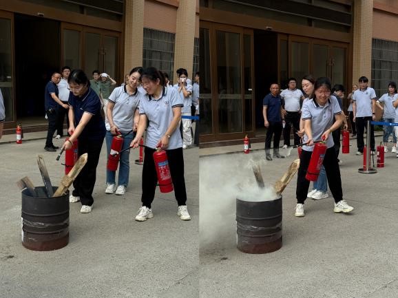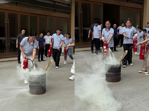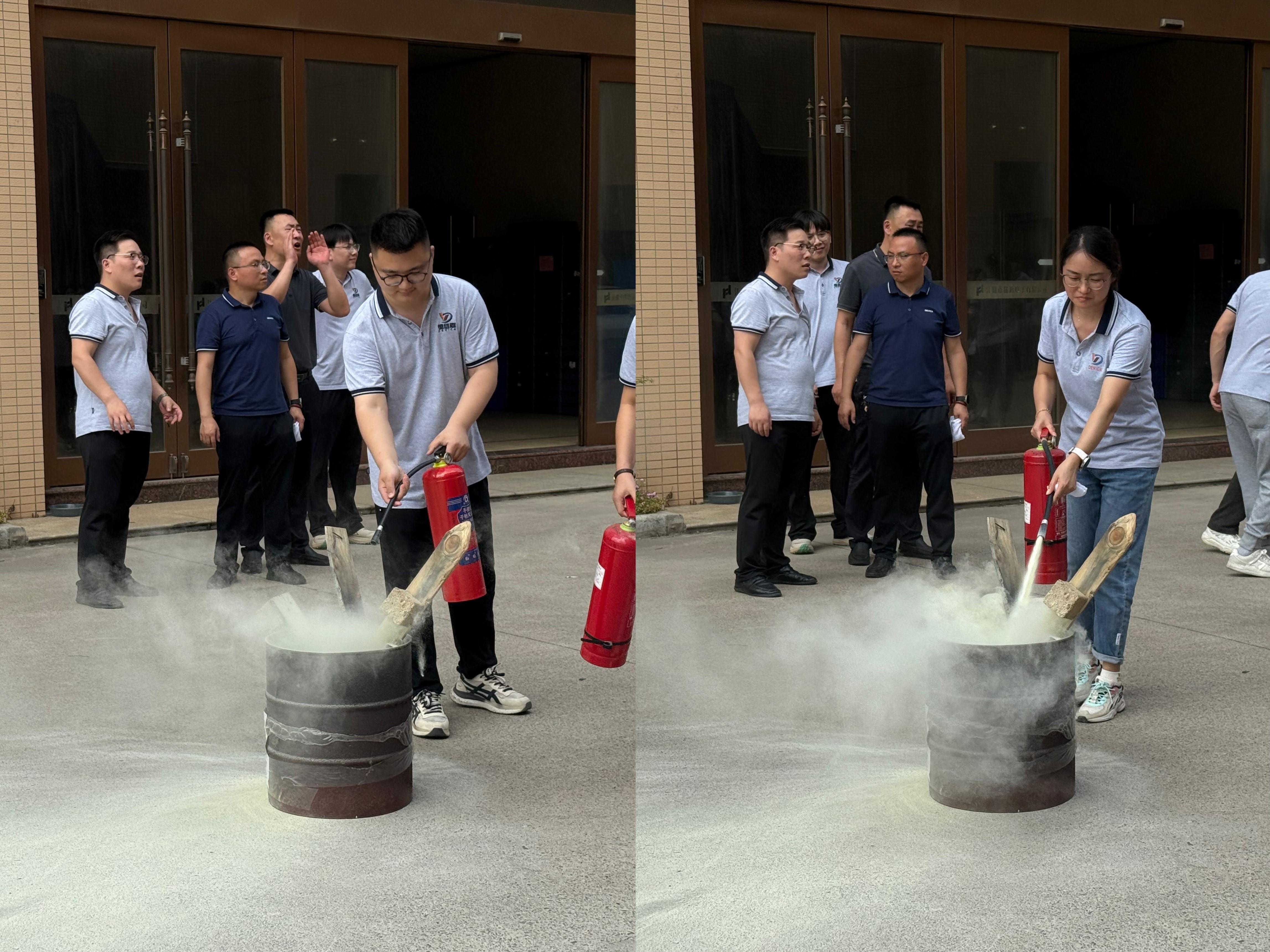 -灭火实操:培训老师演示灭火器“提、拔、握、压”四步法,人员轮流操作扑灭油盆火。